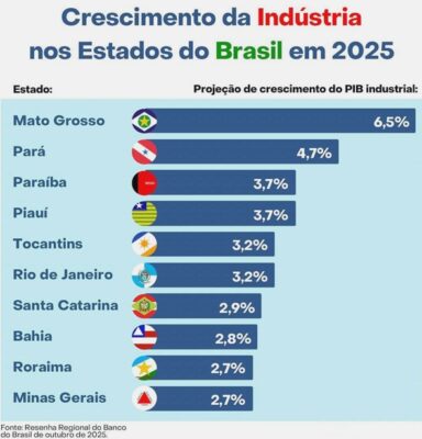 Os estados que lideram as taxas de crescimento do setor industrial no Brasil são Mato Grosso (6,5%), Pará (4,7%), Paraíba (3,7%), Piauí (3,7%) e Tocantins (3,2%), enquanto os piores desempenhos do País são de dois estados nordestinos que fazem divisa com a Paraíba: Rio Grande do Norte (-1,4%) e Pernambuco (-1,4%).