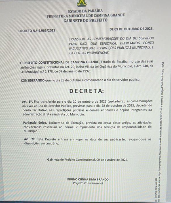 Tradicionalmente o dia do Servidor Público é celebrado no dia 28 de outubro. O decreto nº 4.966/2025, a que o ClickPB teve acesso, determina a aplicação do ponto facultativo em todas as repartições públicas municipais, abrangendo órgãos da administração direta e indireta de Campina Grande.