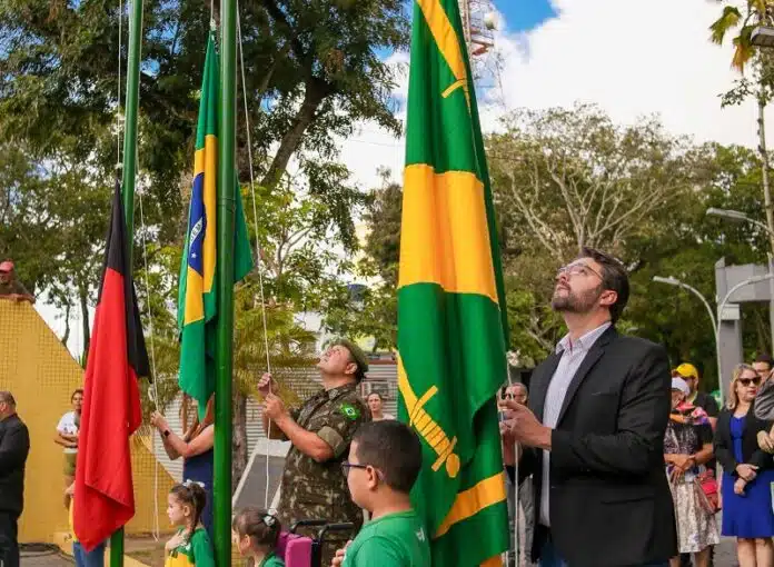 Norma Sueli, a Coordenadora de Eventos da Seduc, afirma: “O hasteamento acontece às 8 horas da manhã com convidados. Cada convidado realiza o hasteamento de cada bandeira, logo após, são tocados os três hinos.”